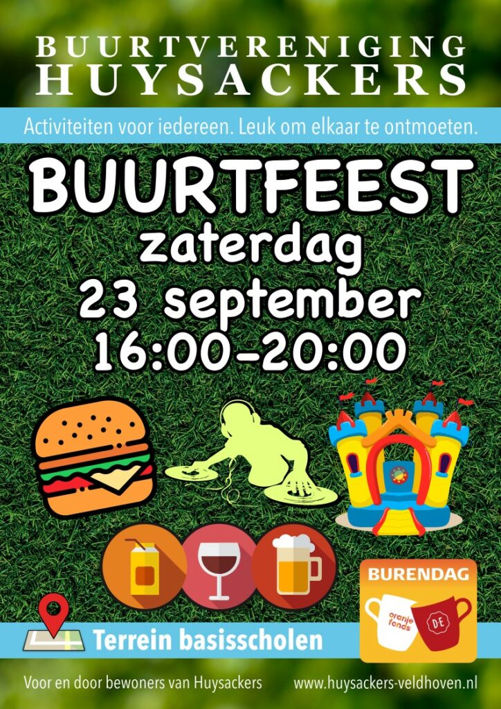 Op zaterdag 23 september organiseren we het jaarlijkse buurtfeest in Huysackers. Je bent welkom van 16:00 tot 20:00 uur op het speelveld naast de (tijdelijke) basisscholen.
