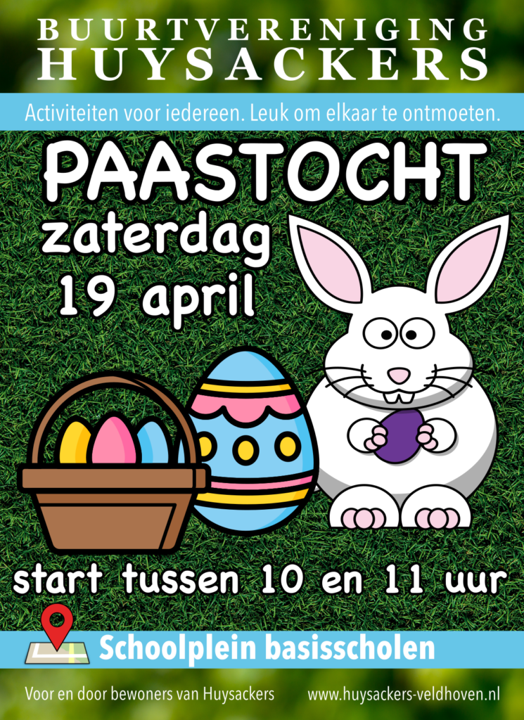 Ook dit jaar is de paashaas zelf aanwezig en zorgen we voor een kleine attentie voor de kinderen aan het einde van de tocht. Er is koffie, thee en limonade. De kinderen kunnen ook nog meedoen met een leuke knutselopdracht. Deze activiteit is gratis voor iedereen uit de buurt Huysackers.