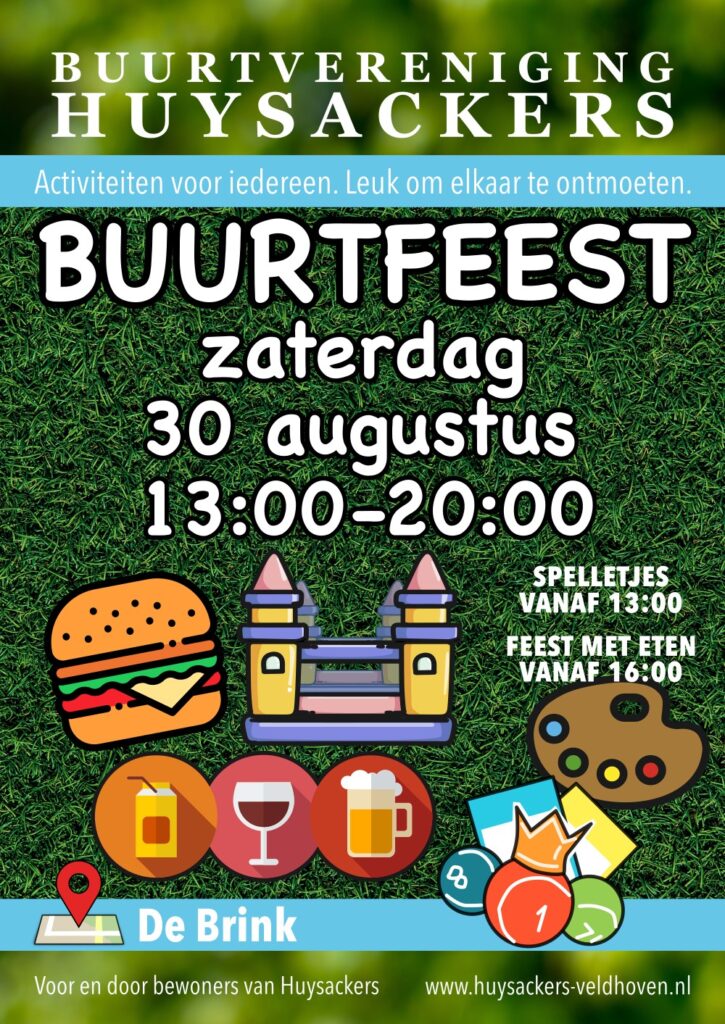Op zaterdag 30 augustus 2025 organiseren we het jaarlijkse buurtfeest in Huysackers. Je bent welkom van 13:00 tot 20:00 uur op de Brink – het grote veld in het centrum van de buurt nabij de basisscholen.